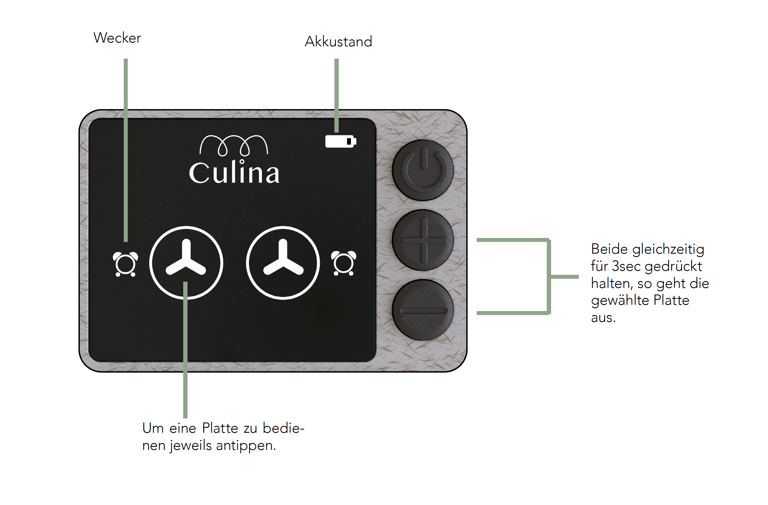 Culina verfügt über eine Induktionsplatte mit einer Arbeitsplatte aus Bambus. Die Holzplatte dient zum besseren Schneiden, da die Lebensmittel nicht so schnell wegrutschen und die Messer nicht stumpf werden. Es werden spezielle Pfannen benötigt. Diese sind so aufgebaut, dass es einen Silikonring gibt, der einen Abstand zwischen Pfannenboden und Arbeitsplatte macht. Zudem hat es vier Lücken, damit die heisse Luft unter der Pfanne entweichen kann. Da der Silikonring direkt auf der Arbeitsfläche aufliegt, rutscht die Pfanne nicht, wenn man Culina bewegt.