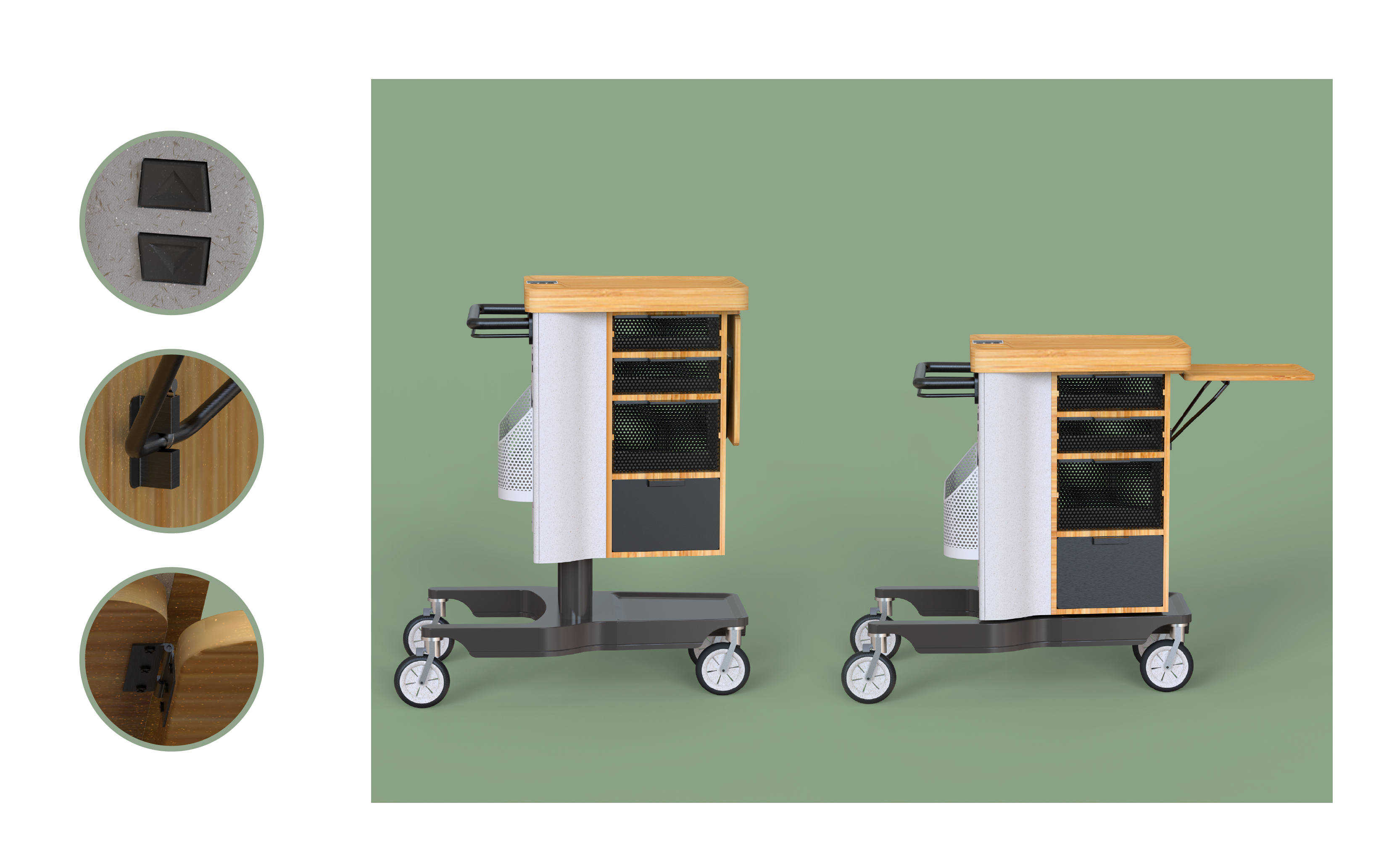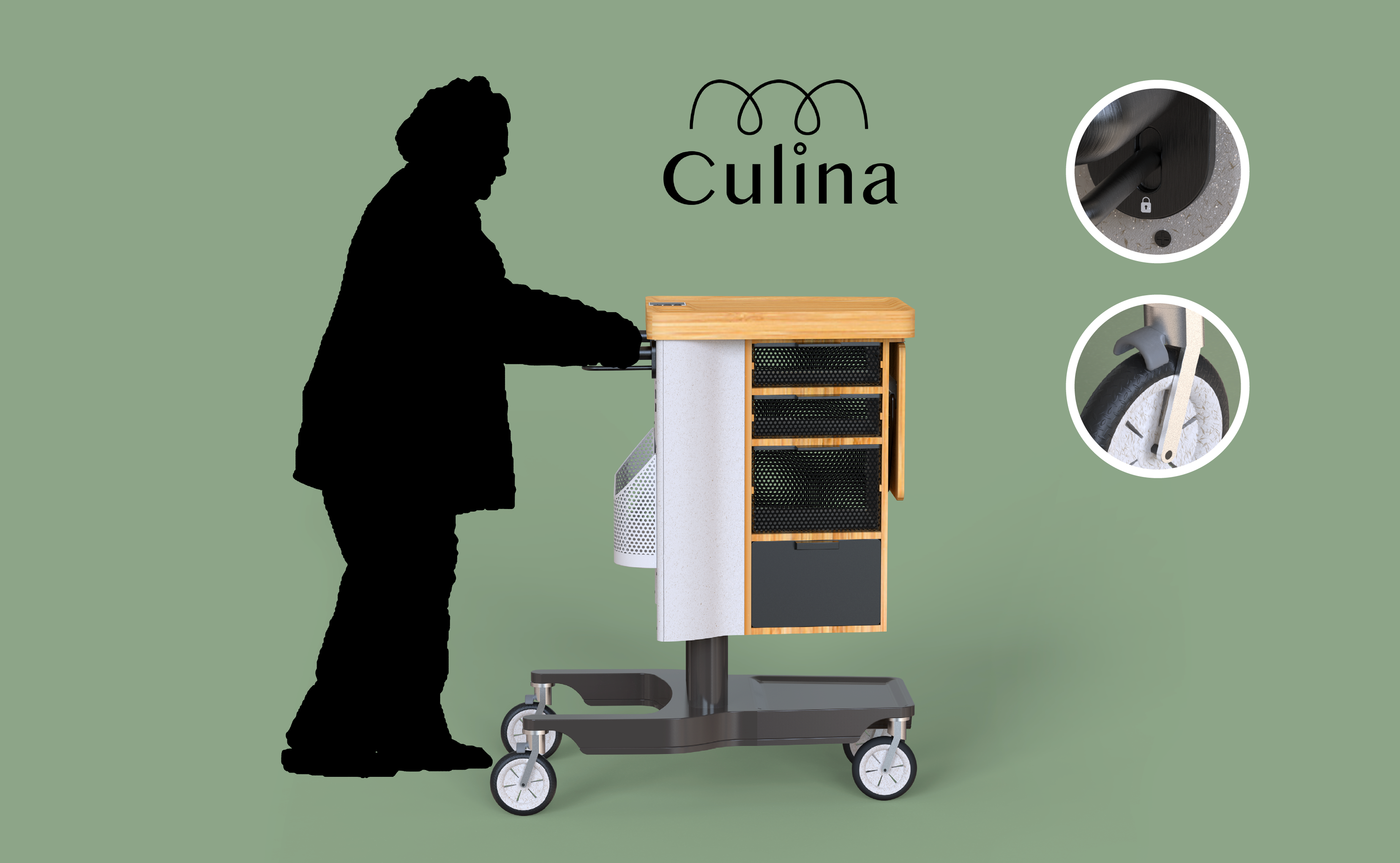 Eine Welt mit deutlich mehr älteren Menschen als jungen, wird unsere Zukunft sein. Dafür braucht es neue Produkte, die Jung und Alt gleichermassen im Design berücksichtigen. Aus der Analyse von Zukunftsszenarien entstand Culina, eine aus Bambus gefertigte mobile Küche bestehend aus: Verstaumöglichkeiten, ein Kühlfach und ein Induktionsfeld. Das ergonomische, höhenverstellbare Design dient einerseits den Bedürfnissen älterer Menschen, andererseits erleichtert es den Alltag Jüngerer. Denn ob im Büro Mittagessen kochen, am Bett einen Tee aufwärmen oder auf dem Balkon ein Raclette essen: die mobile Küche hilft den Alltag individueller zu gestalten.