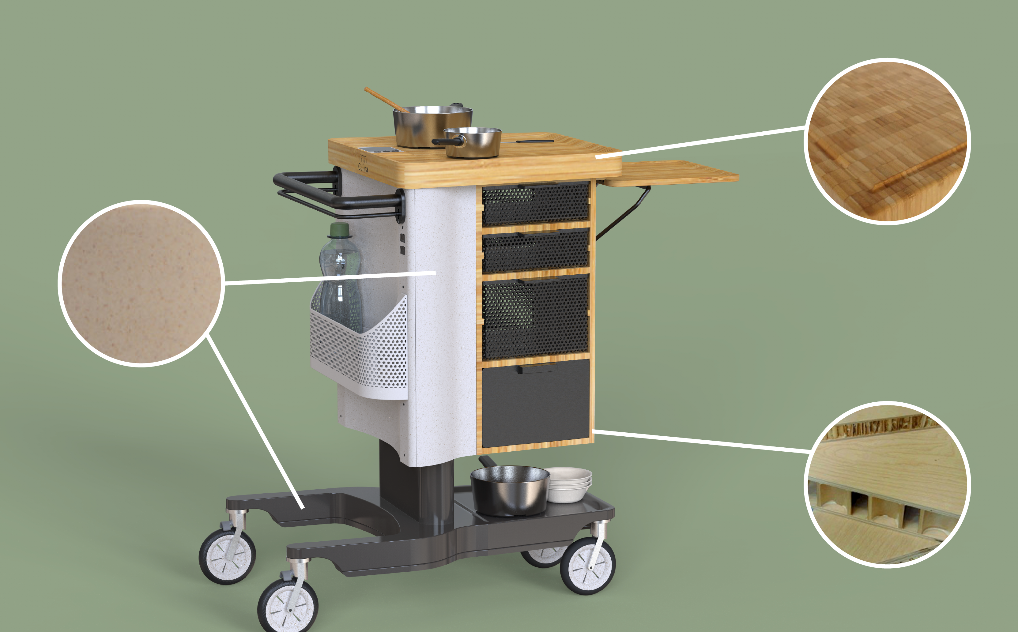 Culina besteht grösstenteils aus Bambus, einem sehr schnellwachsenden Rohstoff. Bambus findet sich nicht nur in der Induktionsherdplatte wieder, sonder auch in Form von Leichtbausandwichplatten und im verwendeten Biokunststoff.