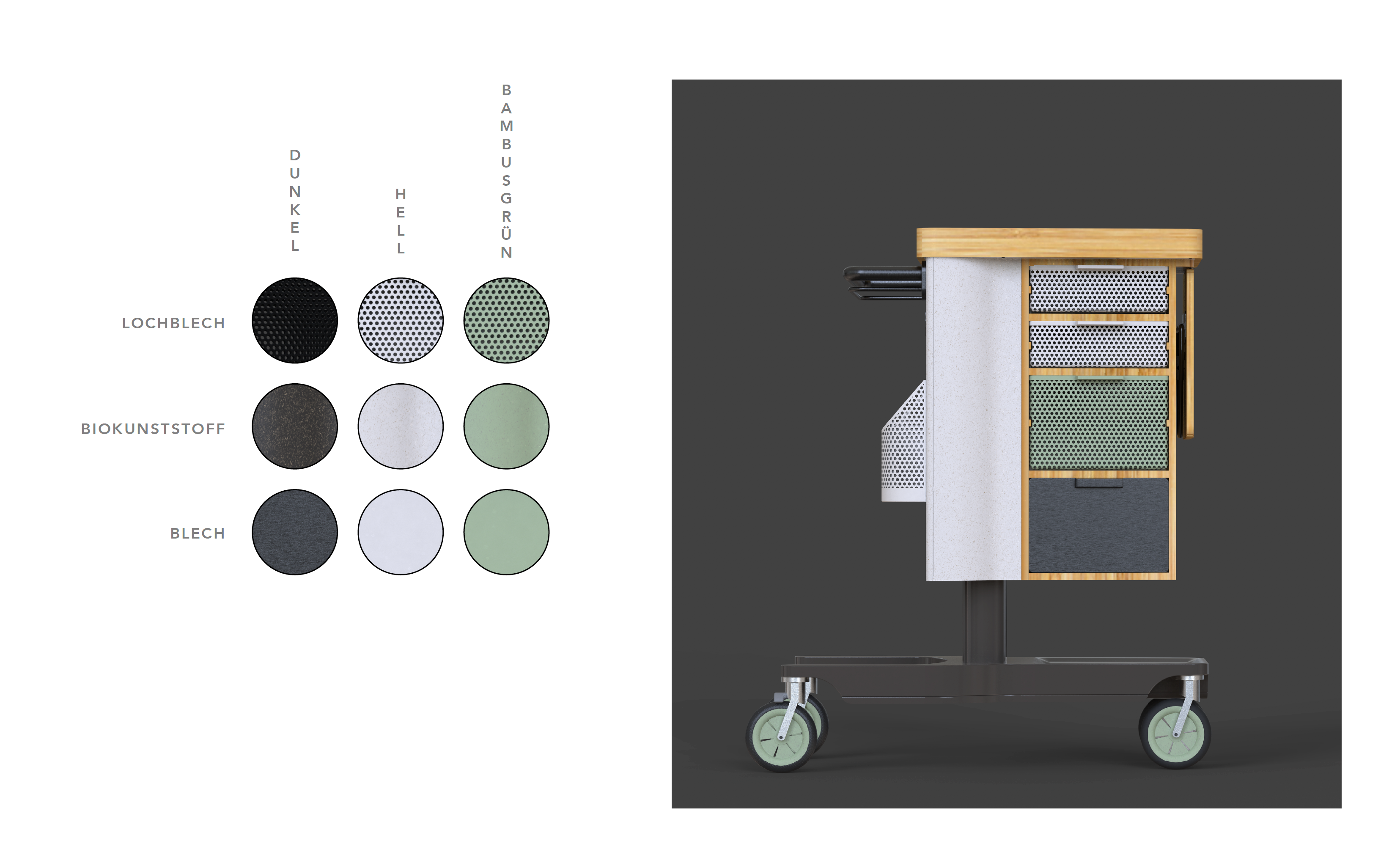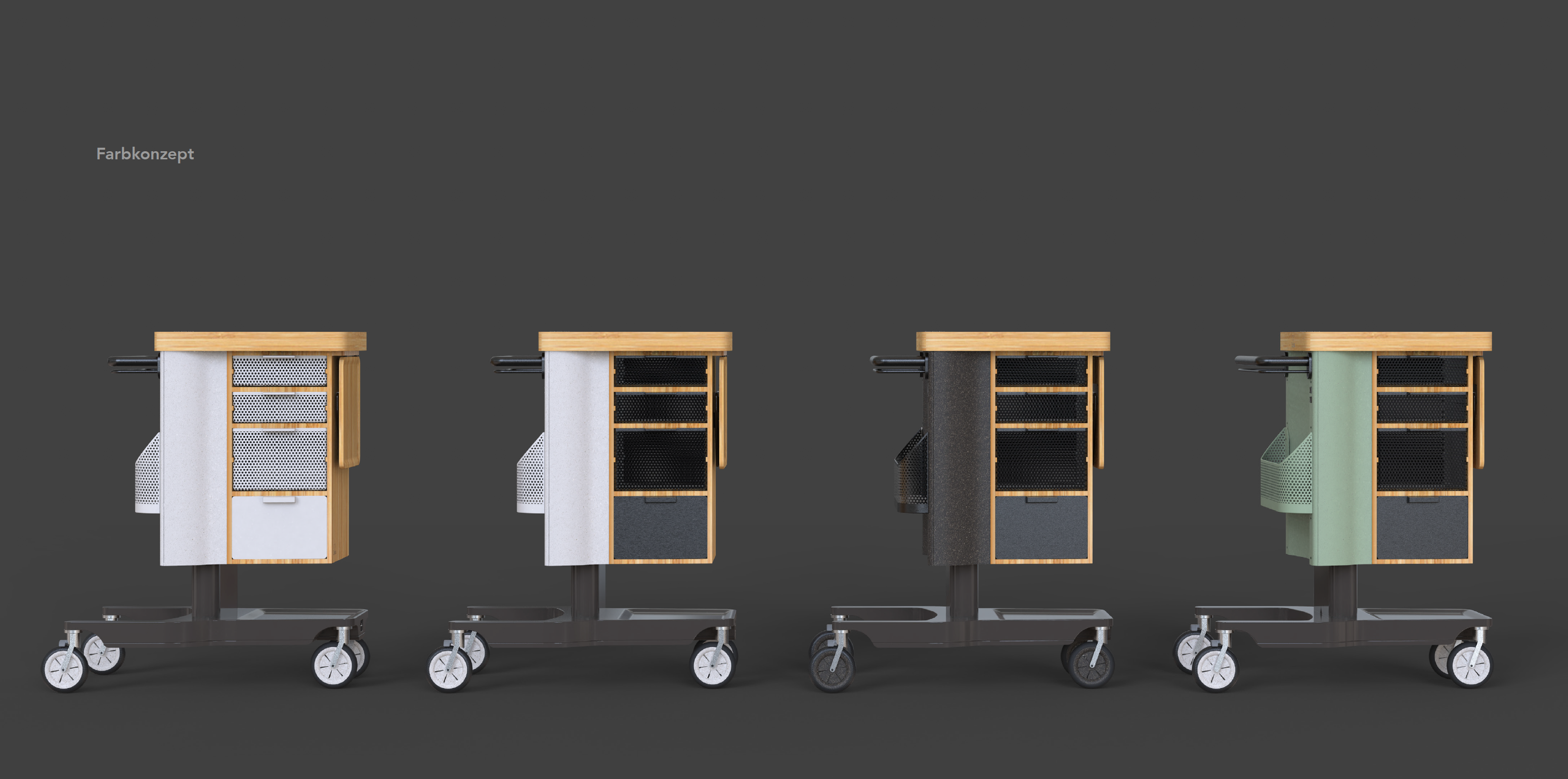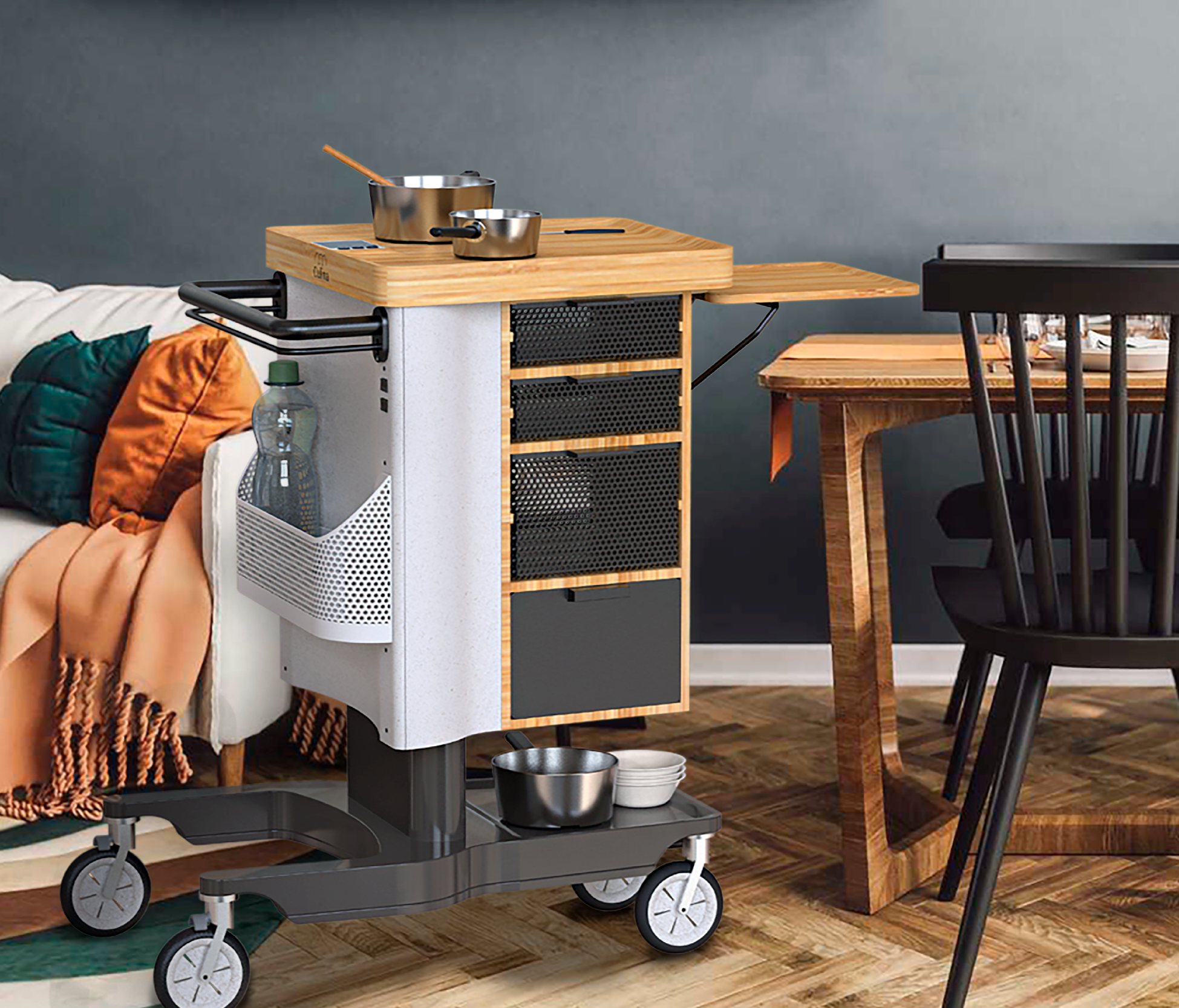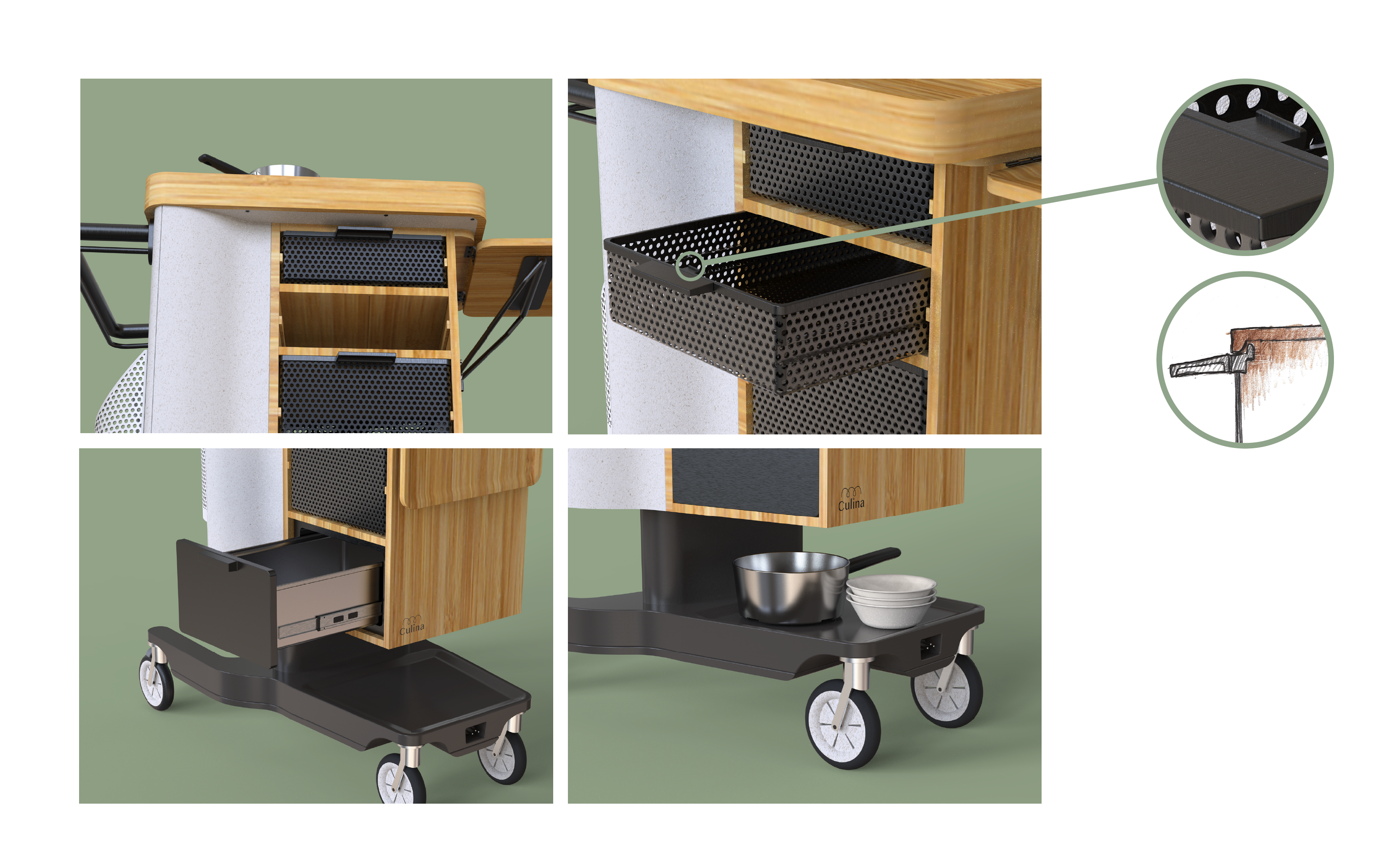 Eine Welt mit deutlich mehr älteren Menschen als jungen, wird unsere Zukunft sein. Dafür braucht es neue Produkte, die Jung und Alt gleichermassen im Design berücksichtigen. Aus der Analyse von Zukunftsszenarien entstand Culina, eine aus Bambus gefertigte mobile Küche bestehend aus: Verstaumöglichkeiten, ein Kühlfach und ein Induktionsfeld. Das ergonomische, höhenverstellbare Design dient einerseits den Bedürfnissen älterer Menschen, andererseits erleichtert es den Alltag Jüngerer. Denn ob im Büro Mittagessen kochen, am Bett einen Tee aufwärmen oder auf dem Balkon ein Raclette essen: die mobile Küche hilft den Alltag individueller zu gestalten.