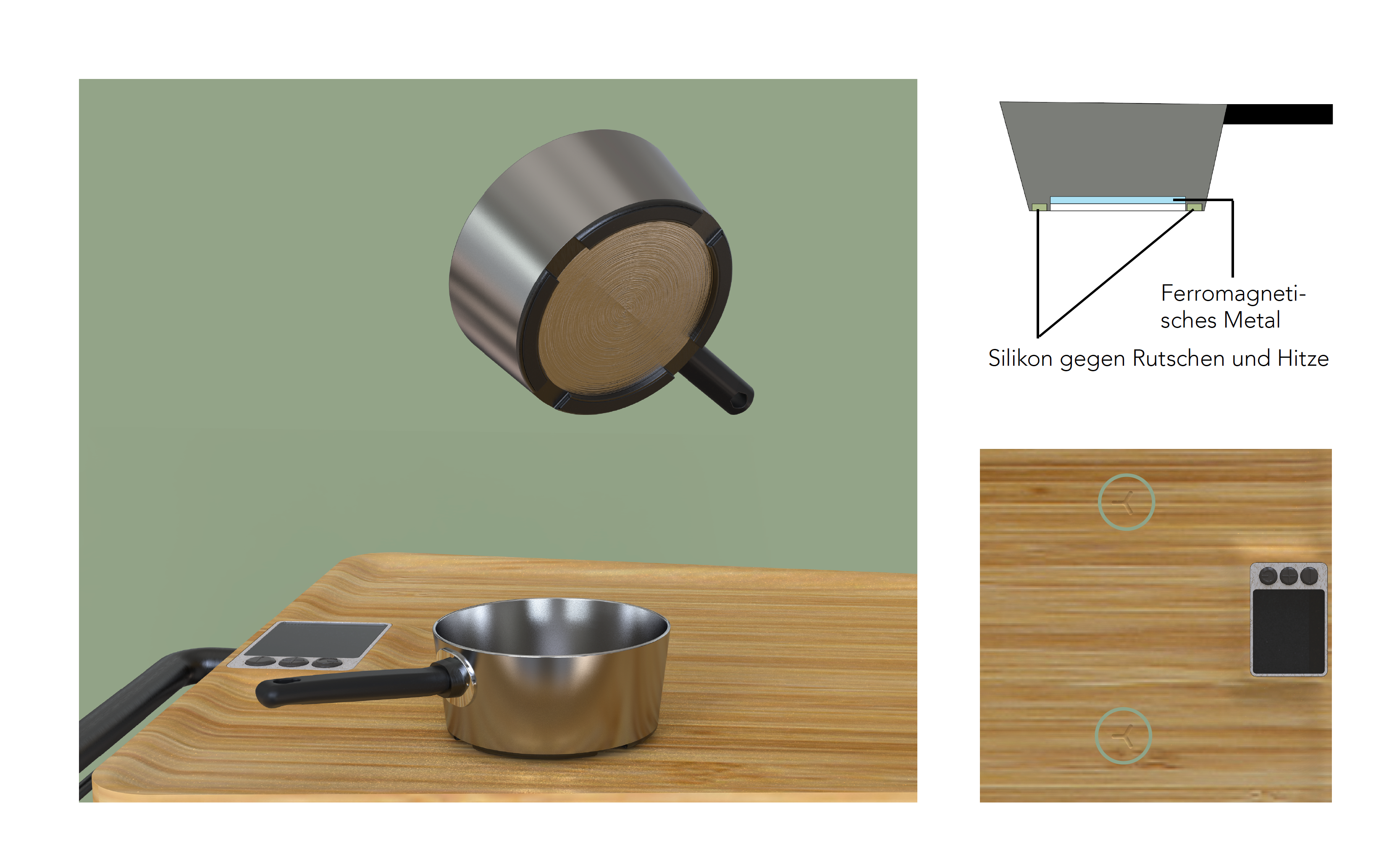 Culina verfügt über eine Induktionsplatte mit einer Arbeitsplatte aus Bambus. Die Holzplatte dient zum besseren Schneiden, da die Lebensmittel nicht so schnell wegrutschen und die Messer nicht stumpf werden. Es werden spezielle Pfannen benötigt. Diese sind so aufgebaut, dass es einen Silikonring gibt, der einen Abstand zwischen Pfannenboden und Arbeitsplatte macht. Zudem hat es vier Lücken, damit die heisse Luft unter der Pfanne entweichen kann. Da der Silikonring direkt auf der Arbeitsfläche aufliegt, rutscht die Pfanne nicht, wenn man Culina bewegt.